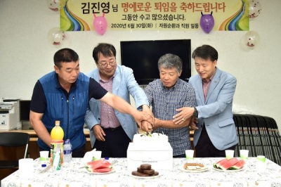 2003년에 제천시 환경미화원으로 공직에 입문한 김진영 씨는 약 18년간 대형폐기물 수거 및 의림지 가로청소원으로 근무해 ‘깨끗한 도시, 다시 찾고 싶은 도시 제천 만들기’에 기여하며 올해 6월 30일자로 명예로운 퇴임을 맞이했다.