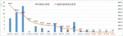가맹점의 업종별 현황은, 음식점이 14만개로 가장 많았고 그 뒤를 이어 생활·교육 10만6000개, 편의점·마트 7만4000개, 기타 5만4000개, 의류·잡화 4만6000개 순으로 나타났다.