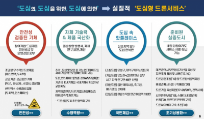 한강에서의 드론 음식배달 서비스를 위한 정밀 착륙, 인공지능 기반 사물인식 기술, 드론 기반의 차량이 없는 강변북로 정사사진 제작 등 새로운 드론서비스를 서울을 비롯한 전국 각지에서 실증한다.