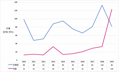 조례 발의 현황을 살펴보면 지난 2010년부터 2018년까지는 단체장의 발의 건수가 의원 발의 건수보다 많았으나 지난해는 의원 발의 건수가 2018년 33건에서 123건으로 급격히 증가해 단체장 발의 건수를 추월했다.
