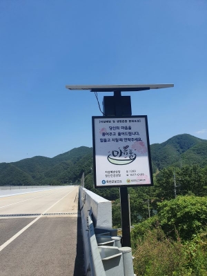 보건소에서는 자살예방 안내판은 야간에도 잘 보이도록 태양광을 이용한 LED조명판에‘마음이 힘들고 지칠 때 연락주세요’라는 문구와 자살예방 상담전화 안내 내용으로 안내면 신장계교 입구에 설치했다.
