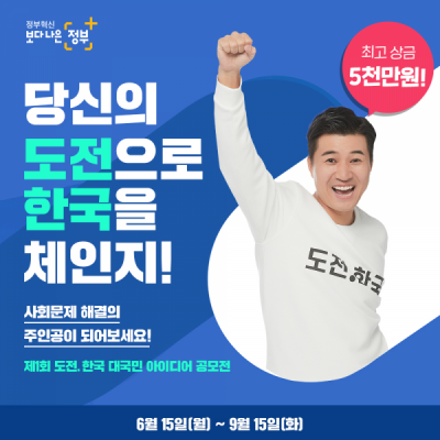 ‘도전.한국’ 국민아이디어 공모전은 행정안전부 주관으로 국민의 창의성과 집단 지성을 활용해 사회문제 해결방안을 모색하고 정책화를 지원하기 위해 올해 처음 개최되는 사업이다.