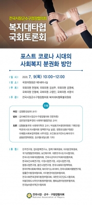 [충청뉴스큐]‘전국시장·군수·구청장협의회’ 산하‘복지대타협특별위원회’는 오는 9일 오전 10시 국회의원회관 제1세미나실에서 “포스트 코로나 시대의 사회복지 분권화 방안”이라는 주제를 가지고 학계, 관계, 정당, 시민단체 등을 망라한 국회 토론회를 개최하기로 했다.