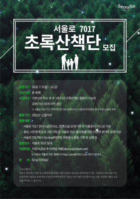 초록산책단 모집은 코로나19 확산에 대비해 20세 이상 65세 이하 성인으로 서울로 7017 인근 지역주민 및 기존 참여자를 우선적으로 선발할 예정이며 활동기간은 올해 8월부터 내년 12월까지 활동할 예정이다 모집 인원은 총 40명이며 기본교육을 필수로 이수해야 한다.
