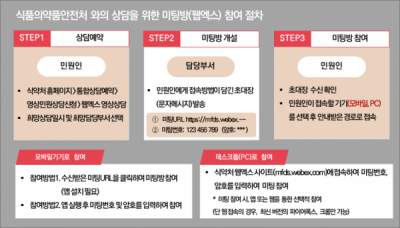 이번 온라인 비대면 민원상담은 식약처 홈페이지 ‘통합상담예약’을 통해 신청한 뒤 미팅 번호 등을 부여받아 PC 또는 모바일 앱에 접속하는 방법으로 상담을 이용할 수 있으며 사용자 편의를 고려해 방문상담을 포함해 지난 6월 서비스를 시작한 ‘온나라 PC 영상회의’ 등도 함께 운영할 예정이다.