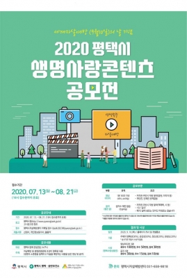‘2020년 평택시 생명사랑 콘텐츠 공모전’접수기간은 7월13일부터 8월21일까지이며 공모 주제는 ‘자살예방 및 생명존중문화 조성이 함축된 내용’, 공모부문은 영상미디어 또는 글귀로 1인당 2점내에서 출품이 가능하다.