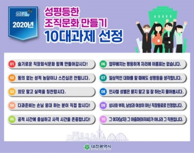 [충청뉴스큐] 대전시는 직원들을 대상으로 성평등한 조직문화를 만들기 위한 아이디어 공모를 실시해 10대과제를 선정했다고 16일 밝혔다.