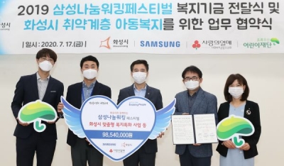 이날 열린 복지기금 전달식에서 삼성전자는 ‘2019 화성시와 함께하는 ‘삼성나눔워킹 페스티벌’’에서 조성된 복지기금 98,540,000원을 전달했다.