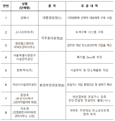 소니코리아는 녹색구매 시스템 구축과 환경발자국 관리로, 청라힐스테이트 아파트관리사무소는 입주민 대상 에너지절약 교육과 탄소포인트제 97.8% 가입의 공로로 각각 국무총리 표창을 받는다.
