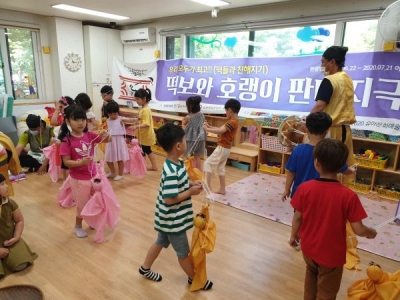 극단꼭두광대의 창작극인‘떡보와 아리랑 다섯고개 호랭이’를 유아 눈높이에 맞게 개발함으로써 전통 탈과 국악을 접목한 협동체 놀이로 구성됐다.
