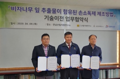 이와 함께 전남산림자원연구소는 지난 6월 ㈜성원유통에 ‘동백나무 추출물을 유효성분으로 포함한 항진균용 조성물’ 특허기술을 추가 이전했으며 현재 손소독제, 물티슈 등 제품들이 개발되고 있다.