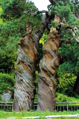 두 향나무는 한 나무가 다른 나무에 절을 하는 듯 예의 바른 스승과 제자의 모습을 하고 있다.
