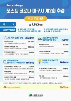 [충청뉴스큐] 대구시는 코로나19 장기화로 인해 어려워진 시민의 삶을 보듬고 경제위기를 조기에 극복하는 한편 포스트 코로나 시대를 대비한 새로운 성장 발판을 마련하기 위해 제1회 추경예산 9조 6,662억원 보다 9,943억원이 증가된 10조 6,605억원 규모의 제2회 추가경정예산안을 편성해 시의회에 제출했다.