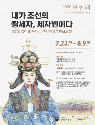 [충청뉴스큐] 문화재청 궁능유적본부와 한국문화재재단은 궁궐 활용프로그램‘2020년 종묘 묘현례’에서 왕세자와 세자빈 배역으로 참여할 시민배우를 공개 모집한다.
