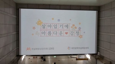 [충청뉴스큐] 대전시는 자살예방과 생명존중 문화조성을 위해 대전역 지하철 출구, 매표소 앞, 지하철 탑승구에 홍보문구를 담은 대형스크린과 빛 조명을 설치했다고 23일 밝혔다.