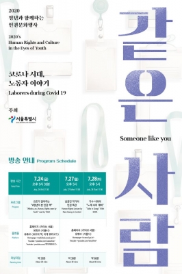 이번 ‘2020 청년과 함께하는 인권문화 행사 ‘같은 사람’’은 서울시 유투브, 서울시 홈페이지 ‘라이브 서울’를 통해 7월 24일부터 7월 28일까지 순차로 공개되며 어디서든 언제든 온라인 방송을 시청할 수 있다.