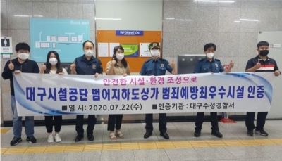 [충청뉴스큐] 대구시설공단 범어지하도상가는 지난 22일 대구수성경찰서로부터 ‘범죄예방 최우수시설’ 인증을 획득하고 인증패 수여식을 가졌다.