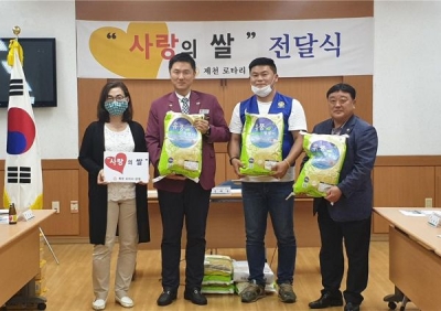 제천로타리클럽은 생활형편이 어려운 가구에 도움을 주고자 23일 남현동 행정복지센터에서 열린 남현동바르게살기위원회 월례회의에서 회장 이·취임식 때 축하화환 대신 받은 백미 10kg 38포를 기탁했다.
