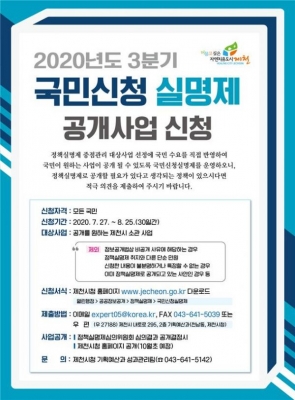 [충청뉴스큐] 제천시는 7월 27일부터 오는 8월 25일까지 2020년 3분기 국민신청 실명제를 운영한다고 밝혔다.