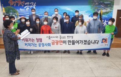 홍봉기 금광면장은 “이번 청렴실천 결의대회를 통해 공무원뿐만 아니라 기관사회단체 회원님들도 법과 원칙을 준수하고 부패를 예방함으로써 청정하고 청렴한 금광면을 함께 만들어 나갈 수 있어 기쁘다”고 말했다.