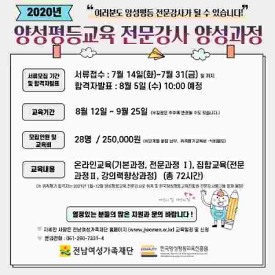 [충청뉴스큐]전남여성가족재단은 전남의 양성평등교육 분야 인재 육성을 위한 ‘양성평등교육전문강사 양성과정’ 교육 참가자를 오는 31일까지 모집한다.