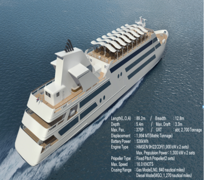 길이 89.2M, 너비 12.8M, 높이 5.4M로 375여명의 승객을 싣고 최대 16.0노트의 속력으로 항해할 수 있다.