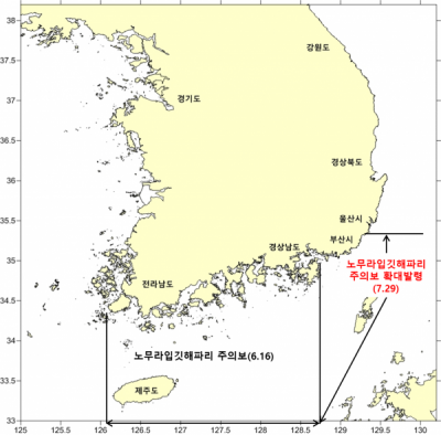 국립수산과학원은 지난 6월 16일 전남, 경남, 제주 해역에 노무라입깃해파리 주의단계 특보를 발령한 바 있으나, 최근 부산시 기장군 해역을 조사한 결과 주의단계 수준의 노무라입깃해파리가 있는 것을 확인해 기장군까지 주의단계 특보를 확대 발령하게 됐다.