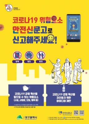 [충청뉴스큐] 대구시는 코로나19 확산이나 감염을 일으킬 수 있는 생활 속 위험요소를 ‘안전신문고’를 통해 신고 받는다.