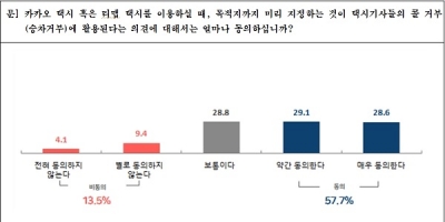 한편, 지난 10월 30일 서울특별시의회 교통위원회가 의뢰하여 긴급하게 실시한 “서울시 앱 기반 택시 목적지 정보 표기 관련 여론조사” 결과에 따르면 응답 시민의 57.7%가 앱택시에 목적지를 미리 지정하는 것이 택시기사들의 콜 거부에 활용된다는 의견에 동의했다.