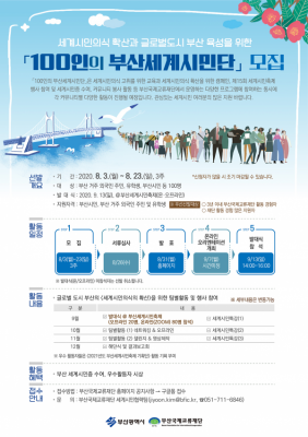 100인의 부산세계시민단 발대식은 다음달 13일에 진행될 예정인 ‘부산세계시민축제’에서 온·오프라인으로 동시에 진행될 예정이다.