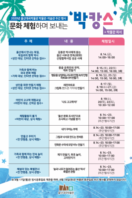 [충청뉴스큐] 울산대곡박물관은 2020년 박물관·미술관 주간을 맞아 8월 14일부터 8월 23일까지 다양한 체험 행사를 운영한다고 밝혔다.