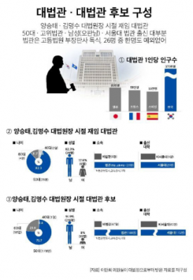 실제 양승태, 김명수 대법원장 임기 중 재임 ‘대법관’ 34명 중 50대 82.3%, 남성 82.3%, 법관 76.4%, 서울대 73.5%였고[표2], 같은 기간 ‘대법관 후보’ 235명 중 50대 75.7%, 남성 91.9%, 법관 80%, 서울대 73.1%였다[표3]. 이미 고등법원 부장판사 승진제도가 폐지됐다에도 김명수 현 대법원장이 제청한 8명 중 7명이 고등법원 부장판사 출신으로 대법관 다양화라는 시대적 요구에 역행하고 있다.