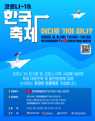 [충청뉴스큐] 문화체육관광부는 한국관광공사, 한국관광학회, 한양대학교 관광연구소와 함께 오는 6일 오후 3시, 온라인 토론회 ‘코로나19, 한국축제 어디로 가야 하나’를 개최하고 유튜브를 통해 생중계한다.