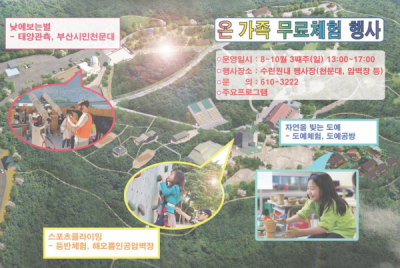 [충청뉴스큐] 부산시 금련산청소년수련원이 오는 10월까지 매월 셋째 주 일요일마다 오후 1시부터 오후 5시까지 ‘온 가족 무료체험행사’를 운영한다고 밝혔다.
