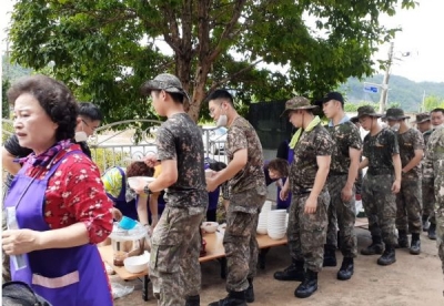 지난 3일 아침부터 피해복구 지원을 나온 제3105부대 1대대 장병 140여명의 점심식사준비를 위해 이른 새벽부터 여성발전센터에 모인 회원 30여명은 십시일반 모은 정성으로 재료를 준비하고 직접 음식을 만들었다.