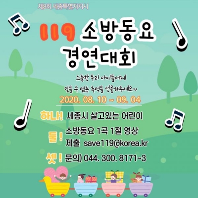 [충청뉴스큐]세종소방본부가 어린이들이 노래로 안전을 배우고 익히는 제8회 세종119동요 경연대회를 개최하기로 하고 10일부터 다음달 4일까지 참가 신청을 접수한다.