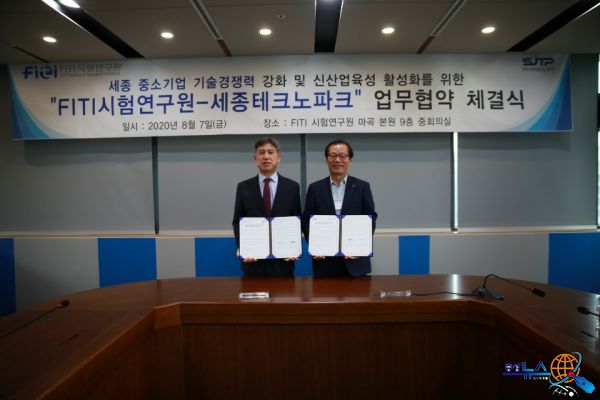 세종시의 지역산업거점기관인 세종테크노파크(원장 김현태)는 글로벌 종합 시험인증기관인 (재)FITI시험연구원(원장 전제구)과“세종 중소기업 기술경쟁력 강화 및 신산업 육성 활성화”를 위한 업무협력협약(MOU)을 지난 7일 체결했다“고 밝혔다.
