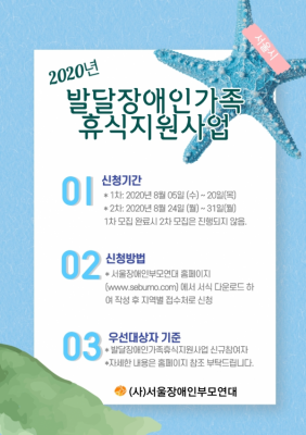 여행을 희망하는 발달장애인 가정은 2020년 사업수행 기관으로 선정된 ‘서울장애인부모연대’ 홈페이지에서 제출 서류를 다운받아 작성 후 본부 또는 25개 자치구별 지회 이메일로 2020년08.20. 까지 신청하면 된다.