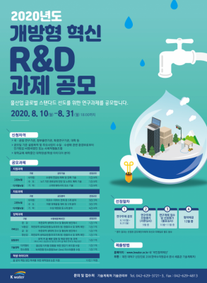 [충청뉴스큐] 환경부 산하 한국수자원공사는 수요자인 국민 중심의 물관리 강화를 위해 국내의 대학과 정부출연기관, 연구기관 등을 대상으로 8월 10일부터 31일까지 ‘개방형 혁신 연구 개발’ 과제를 공모한다.