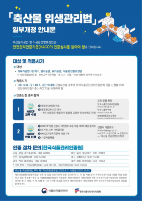 올해 10월 8일 시행 예정인 축산물위생관리법에 따라 법시행 당시 자체 안전관리 인증기준을 작성·운용하고 있는 축산물 HACCP 의무 작업장이 1년 이내인 내년 10월 7일까지 요건을 갖추어 한국식품안전관리인증원에 인증을 받아야 한다는 것이 주요 내용이다.