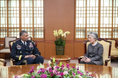 [충청뉴스큐] 강경화 외교장관은 6일 오전 외교부 청사에서 이임을 앞둔 "빈센트 브룩스" 주한미군사령관을 접견하고, 브룩스 사령관이 재임기간 중 급변하는 한반도 정세 속에 굳건한 한미 연합방위태세 견지 및 한반도 비핵화와 항구적 평화 정착이라는 한미 공동의 목표 달성 지원을 통해 한미관계 발전에 기여했다고 평가하고, 노고에 사의를 표명했다.