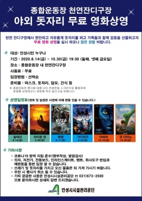 [충청뉴스큐] 안성시시설관리공단에서는 오는 8월 14일부터 10월 30일까지 매월 둘째, 넷째주 금요일 오후 7시 30분에 종합운동장 내 행사용 대형 LED 전광판을 이용해 무료영화를 상영한다고 밝혔다.