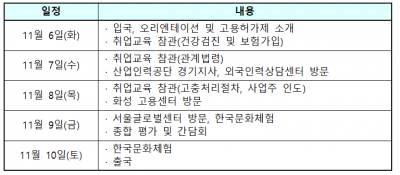 연수단은 재단 외국인취업교육 참관 및 화성고용플러스센터, 한국산업인력공단 경기지사, 외국인력상담센터, 서울글로벌센터 등 외국인노동자 유관기관 방문을 통해 외국인력 선발·도입, 체류지원, 귀국지원 등 고용허가제 시스템에 대한 이해를 넓히게 된다.