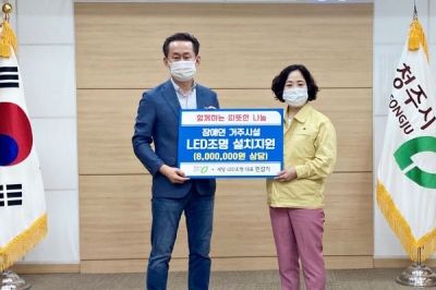 [충청뉴스큐] 새빛 LED조명이 11일 청주시청을 방문해 장애인 거주시설 11개소 LED조명 설치 지원 전달식을 가졌다.