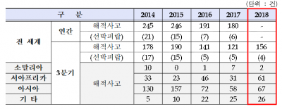 2018년 3분기까지 전세계 해적사고 발생건수는 총 156건으로, 전년 동기 대비 28.9% 증가했다.