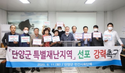 같은 날 신단양지역개발회, 단양군새마을회, 단양군여성단체협의회 등 13개 민간단체도 “3만여 군민의 절박하고 간절한 염원을 담아 기록적인 폭우로 인적·물적 피해에 시름하고 있는 주민과 자치단체가 안심하고 수해복구에 전념할 수 있도록 단양군을 조속히 ‘특별재난지역’으로 추가 지정 선포해 줄 것”을 강력히 요구하고 나섰다.