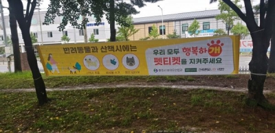 시는 지난 6월 펫티켓 인증샷 이벤트 추진에 이어 반려인과 비반려인과의 갈등 해소와 쾌적한 공원 환경을 조성하고자 펫티켓 홍보 현수막을 주요 공원과 반려견 산책로에 설치했다.