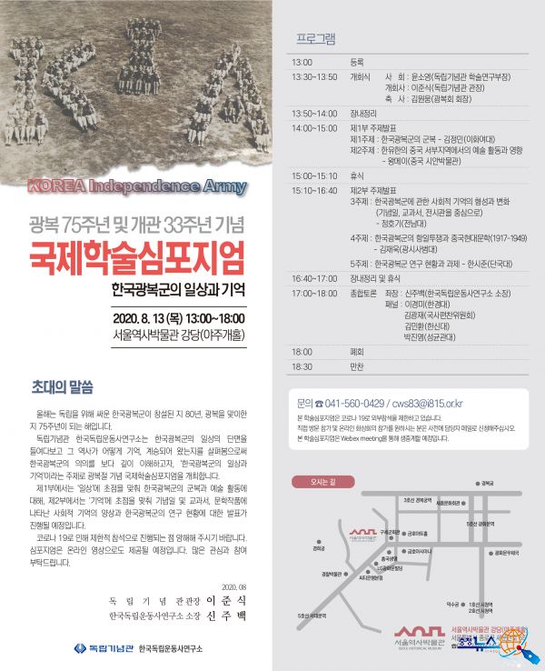 독립기념관(관장 이준식) 한국독립운동사연구소는 광복 75주년 및 개관 33주년, 한국광복군 창설 80주년을 맞아 ‘한국광복군의 일상과 기억’이라는 대주제로 8월 13일 오후 1시부터 서울역사박물관 야주개홀에서 국제학술심포지엄을 개최한다“고 밝혔다 2020년은 한국광복군 창설 80주년이 되는 해이다. 한국광복군은 1919년 4월 상해에서 수립된 대한민국임시정부가 중국에서 지난한 독립투쟁의 과정 끝에 1940년 9월 15일 충칭에서 창설하였다. 이에 1942년에 김원봉이 이끄는 조선의용대가 합류함으로써 일제에 대한 총력전을 전개할 수 있는 기반을 만들었다. 일제의 패망이 임박한 1945년 초부터 미국 전략첩보국(Office of Strategic Services, OSS)과 합작하여 국내진공작전을 준비하기도 하였다. 현재 한국사회에서 한국광복군에 대한 인지도는 결코 낮지 않다. 무장독립운동의 계보를 한말의병-독립군-한국광복군으로 계승된 것으로 인식하고 있으며 교과서 수록, 독립기념관 등 근현대사박물관의 주요 전시물로 등장하고 있으며 독립운동사 분야에서도 비교적 연구성과가 많은 주제이기도 하다. 그럼에도 불구하고 그동안 주로 한국광복군의 구성과 훈련, OSS 작전 등 주체들의 활동과 투쟁 과정, 국제적 관계에 초점을 맞추어진 경향이 있었다. 이번 국제학술심포지엄은 이와 같은 연구현황을 좀 더 확장시켜 한국광복군을 주제로 하여 그들의 복식, 음악 외에 한국광복군을 소재로 한 문학작품을 통하여 문화사와 한중문화교류사의 관점에서 한국광복군의 일상을 들여다보고 우리가 미처 잘 알지 못했던 한국광복군의 이면을 조명하고자 한다. 이를 위해 의류학, 사회학, 중국현대문학 등 다양한 분야의 전문 연구자들과 한국독립운동사 연구자들이 결합하여 5개 주제발표와 토론을 진행한다. 제1부에서는‘일상’에 초점을 맞춰 한국광복군의 군복과 예술 활동에 대해, 제2부에서는 ‘기억’에 초점을 맞춰 기념일 및 교과서, 문학작품에 나타난 사회적 기억의 양상과 한국광복군의 연구 현황에 대한 발표가 진행될 예정이다. 이번 국제학술심포지엄에서 특히 주목해야할 점은 그 동안 부족한 자료로 인해 실체가 불분명했던 한국광복군 군복의 변천사를 면밀히 고증하는 논문을 김정민 박사(이화여대)가 발표하며, 중국 시안(西安)박물관의 왕메이 부관장은 코로나19로 인한 서면 발표를 통해, 한국광복군 제2지대 선전조장으로 활약한 한유한(한형석)이 한국광복군의 군가 등의 음악을 작곡하여 광복군의 사기진작에 기여한 외에 중국 아동음악계를 견인하여 그 후에 중국의 뛰어난 예술가로 성장한 이들을 다수 육성했다는 점을 한국학계에 처음으로 보고한다. 또한 광시사범대학의 김재욱 교수는 그동안 국내 역사학자들이 한국광복군 참모장 이범석의 자서전으로 이해해 온