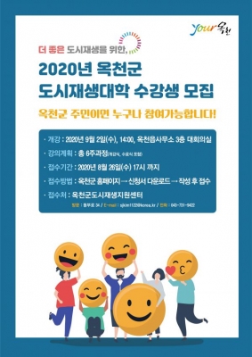 옥천군과 옥천군 도시재생지원센터는 18일부터 26일까지 도시재생대학을 홍보하고 교육신청서를 받는다.