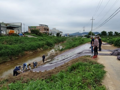 해당 구간은 지난 집중호우로 유실되어 흄관 매설 등 응급복구가 진행되었으나, 제방 법면 노출로 인해 이번 주말 예상되는 호우에 다시 유실될 우려가 있어 안성2동 통장단의 자발적인 참여로 추가 복구 작업을 실시했다.